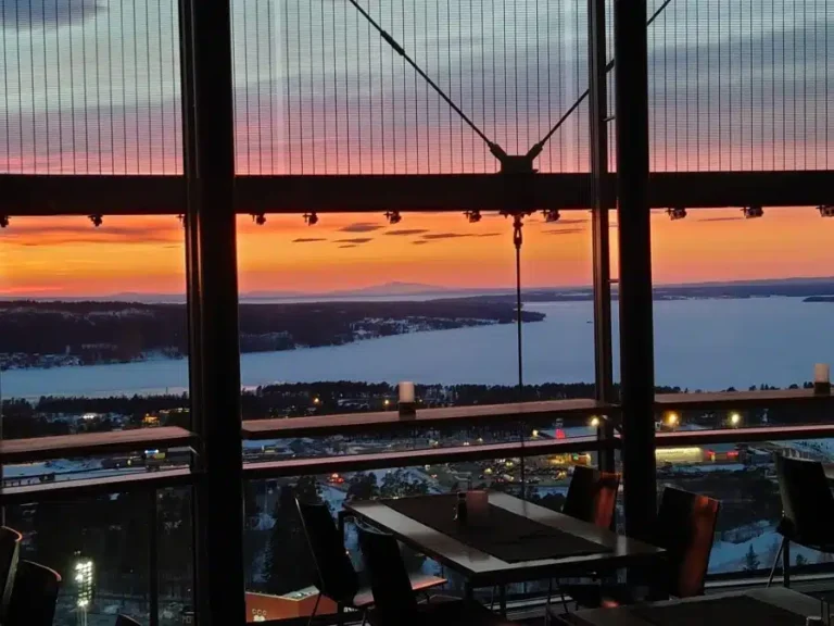 Själva restaurangen har ca 2 meter höga fönster som inramning och inredningen i enkel men trivsam miljö för både enkel och fin fest.